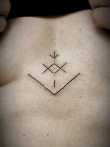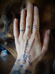 - Rituel d’encrage – 1h30 à 2h (temps de reliance, tatouage éphémère des symboles, activation énergétique, lecture de ta guidance)